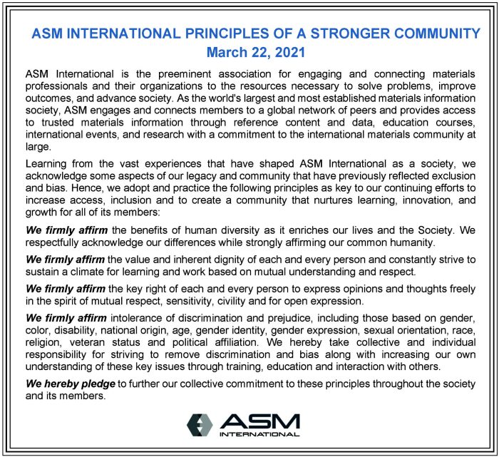 ASM International recognizes that our members, volunteers, and employees come from a wide variety of backgrounds and ethnicities. It is ASM’s commitment to support opportunities for members from all backgrounds in our policies, programs, courses, and interactions with others. As an organization, we affirm all people regardless of their age, culture, abilities, ethnic origin, gender identity, marital status, nationality, race, religion, sexual orientation, education level, and socioeconomic status.