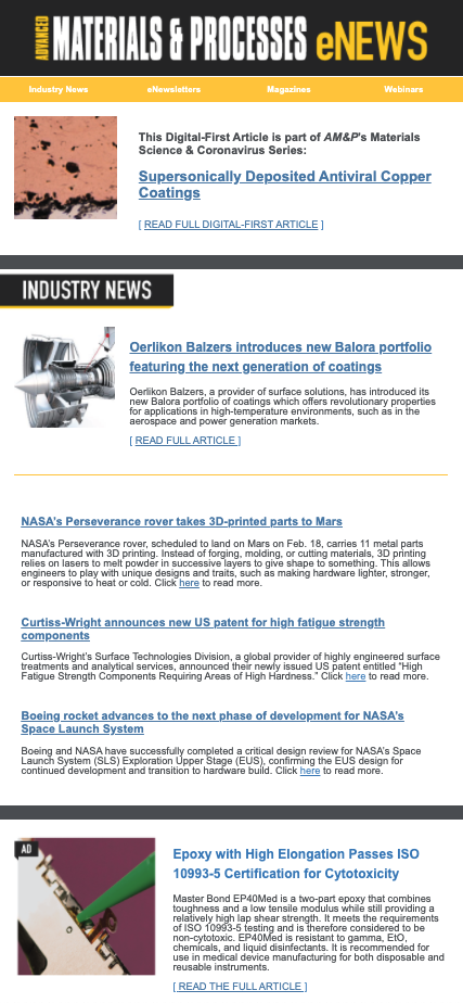 With a growing circulation of over 22,000, AM&P eNews delivers timely industry news, technology updates, fun videos and facts, and much more to materials professionals from around the globe. Advertise in AM&P to get the reach, frequency and views that you want with a target audience of materials professionals.