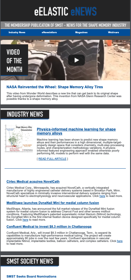 eElastic is the only newsletter dedicated exclusively to shape memory and effect alloys – and it is where you will find over 1,000 industry professionals. Published by the International Organization on Shape Memory and Superelastic Technologies (SMST), an ASM affiliate society, this quarterly newsletter presents the latest news about memory materials, applications and the SMST society. The members of the SMST community also have exclusive access to members-only feature articles written by industry thought leaders.