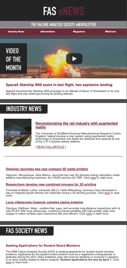 The quarterly newsletter from the Failure Analysis Society (FAS).